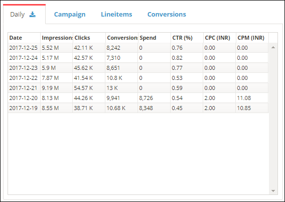 You can scroll down to see the reports that show the campaign performance on a daily basis, the complete performance of the campaign, the lineItems performance and conversions. These reports are either supported by graph or pie chart, and you can download these reports.