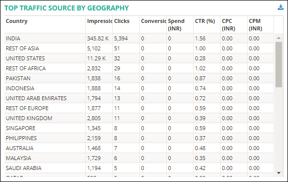 You will also see a TOP TRAFFIC SOURCE BY GEOGRAPHY report that after scrolling the page down, which shows the campaign performance in the selected geographical area, and you can download this report.