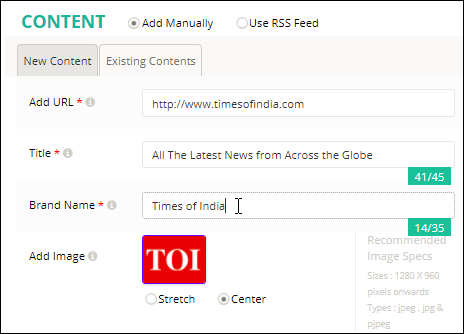 Select Single Image > Add Manually > New Content then enter URL, Title and Brand Name, upload an image and crop (or adjust) the selection areas.