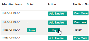 - Identify the lineItem, go to Action column, click Pay, and make payment.
